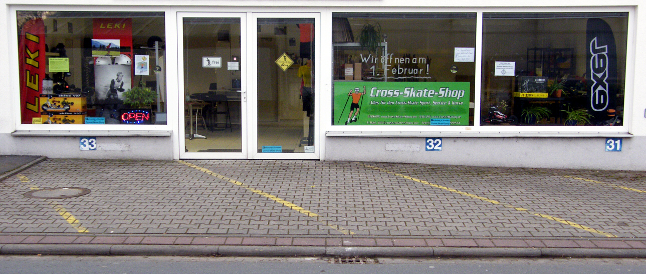 In hellen Räumen, die ein- und ausfahrtfreudlich ebenerdig angelegt sind, werden die aktuell besten Cross-Skates präsentiert. Sonderöffnungszeiten lassen sich auch gern außerhalb der angegebenen Öffnungszeiten vereinbaren. Begonnen hat der gesamte Service rund um den Cross-Skating Sport bereits 2005, als nur wenige Meter von hier die ersten Kurse und Personaltrainingstunden für Cross-Skater angeboten wurden. Seitdem ist der Laden von 18 über 55, 60 und 200 Quadratmeter Ladenfläche auf gut 140 Quadratmeter angewachsen. Angewachsen deswegen, weil die Fläche des letzten – auf dem Papier – größeren Ladenlokals durch viel zu viele Gänge leider nicht voll nutzbar war. Jetzt zeichnet sich der quadratisch angelegte Laden durch optimal kurze Wege und maximale Raumausnutzung aus. Direkt von den Kundenparkplätzen aus kann man den Laden betreten. Selbstverständlich werden hier auch von Montag bis Samstag engagierte Beratung (ebenfalls bei Sonntagsveranstaltungen) und ganzjählich Cross-Skating Kurse angeboten. Auch Probefahren ist vor Ort im Laden möglich, für Routiniers auch außerhalb gleich am Laden oder im angrenzenden Park.